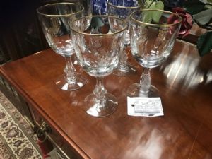 Set of 5 seven-inch stem wine glasses with gold rims. Tiffin Palais Versailles See separate listings for cordials and water glasses.