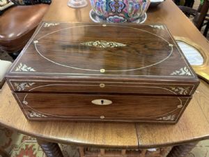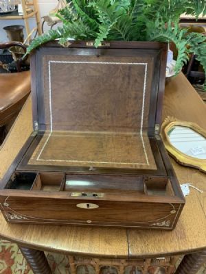 Antique Rosewood & Brass Inlaid Lap Desk w/gilt tooled leather writing slope Hanna Dealer #98